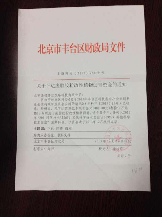 北京嘉格偉業(yè)筑路科技有限公司自成立以來,專心致力于橡膠瀝青、植物瀝青、貼縫帶等等路面材料的研發(fā)與推廣,其科研項目【廢胎膠粉改性植物瀝青】獲得北京市豐臺區(qū)科技型中小企業(yè)創(chuàng)新基金支持項目,并撥款350000元整,專項用于廢胎膠粉改性植物瀝青。