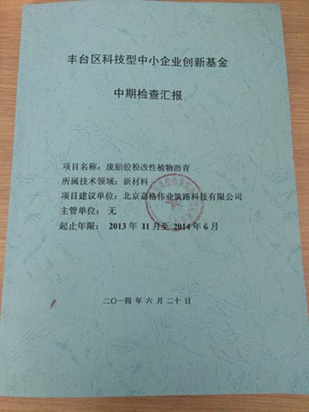 嘉格偉業(yè),其科研項目【廢胎膠粉改性植物瀝青】2013年末獲得了北京市豐臺區(qū)科技型中小企業(yè)創(chuàng)新基金支持項目,并獲得資金支持350000元,專項用于廢胎膠粉改性植物瀝青研究。至今項目研發(fā)過半,年中成果匯報工作正在有條不紊的進行中。技術部專門召開了專門會議,部署了中期總結匯報工作人員分工及時間要求。