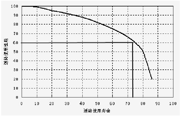根據(jù)美國對不同等級道路進行的跟蹤調(diào)查總結,在道路的使用性能和壽命方面有一個共同的特征,就是一條質(zhì)量合格的道路使用壽命在四分之三的時間內(nèi),性能會下降百分之四十(把這個階段稱為預防性養(yǎng)護階段),如不能及時進行養(yǎng)護,在隨后的使用壽命時間內(nèi),性能會急劇下降,這樣會造成養(yǎng)護成本大幅度的增加。如圖所示